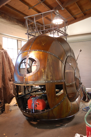 Jon Sarriugarte, a blacksmith and fire artist, makes adjustments to the flame-emitting feelers on the front of The Golden Mean, his snail-shaped art car.