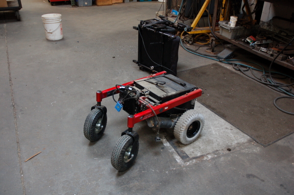 I have had a similar wheel chair and was planning some kind of project like your building. How did you mount the wheels? Did you cut down the old plastic wheels and mount the new wheels to them? Will it be at BM?