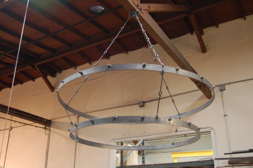 This is one of 4 5 foot wide light fixtures that will be installed next month. Each one of those tubes on the main ring will have a bulb and the wires will drape from one to the other. We also made the wall sconces and brick oven tools for them. I’m looking forward to eating under these lights!