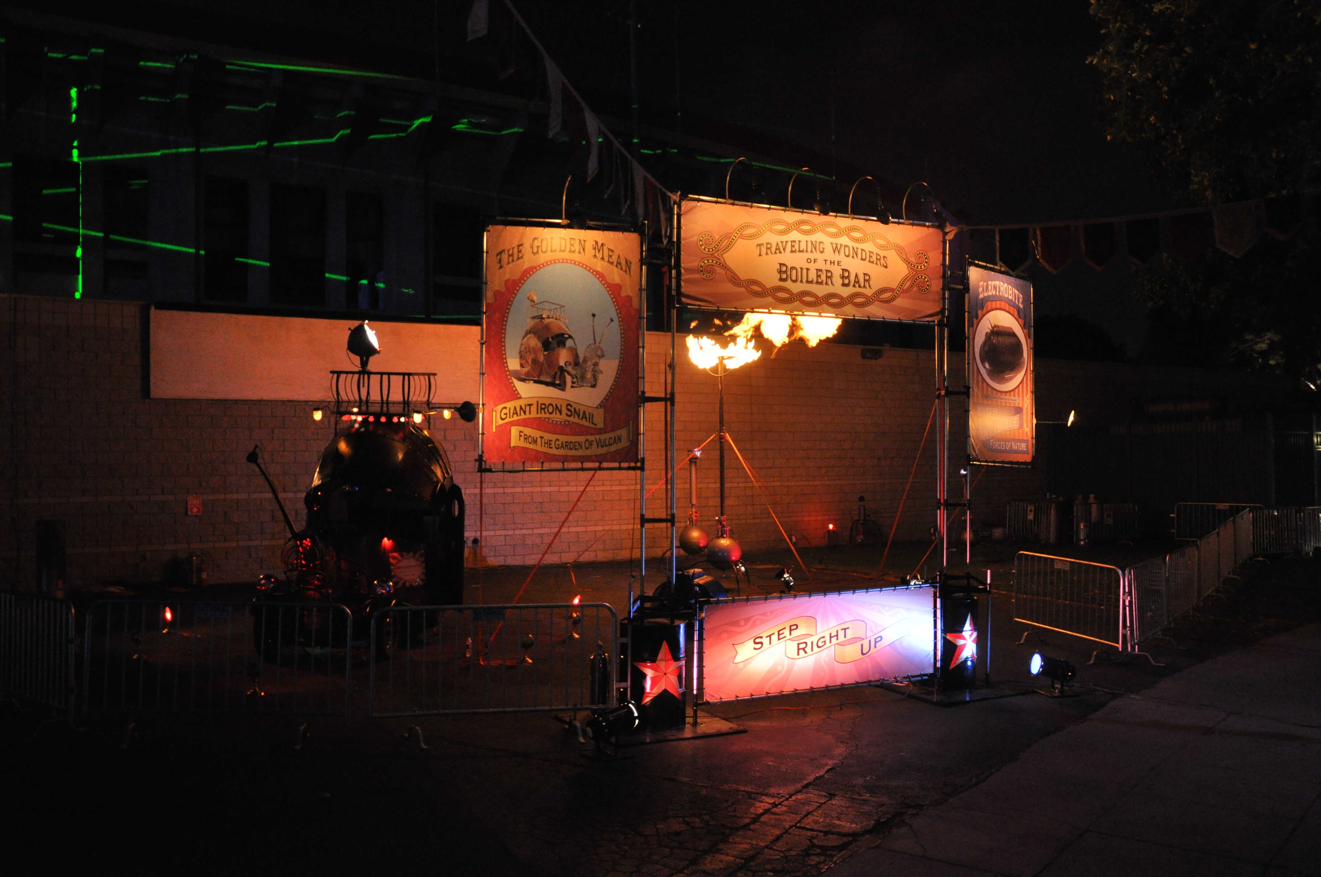 We have several sets in which we can host your event. Our most popular at the moment is the Boiler Bar and stage. We have the following items available to make the illusion of a 1920’s-1930’s Oil town bar complete with a stage, dancers, performers, fire sculptures, a still and furniture. We do Raves, Country & Western, weddings, corporate parties, fairs, all ages shows, birthdays, and stage acts. The depression era is all the rage now, so let’s party!