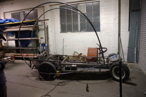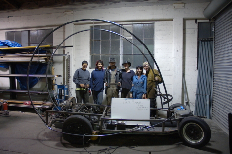We worked until late on Monday night, and we got quite a bit done. The 2 main supports that will form the sides of the shell are on as well as a sample of the growth rings along the front. Isn’t it a sexy shape? Lauren got he engine purring. Tansy, Alex, and Kyrsten wrapped the spiral for the side. It turned out really nice! The last picture is the crew: Alex, Lauren, Christopher, Tansy, Kyrsten, and Jon. FYI, Kyrsten is not a midget. All those other people are over 6 feet tall…