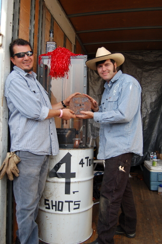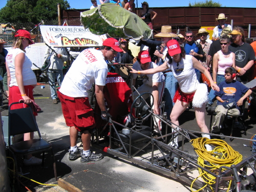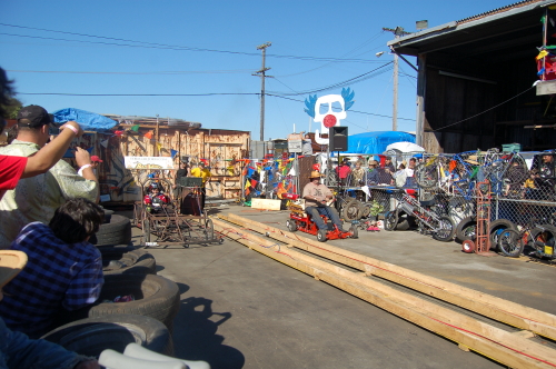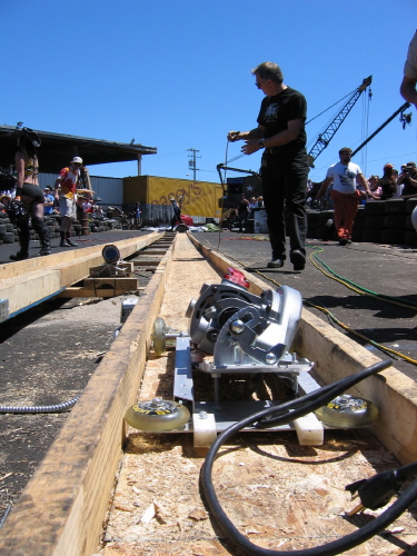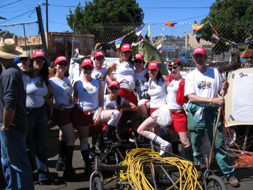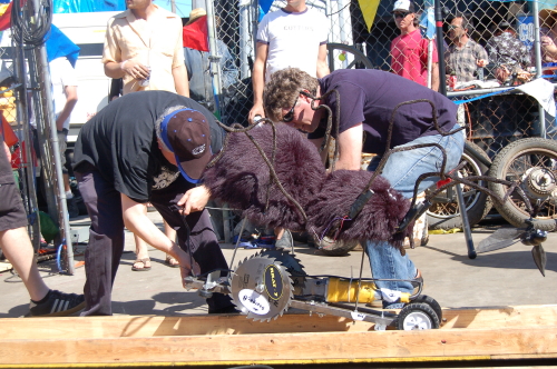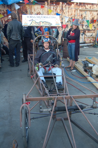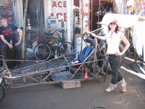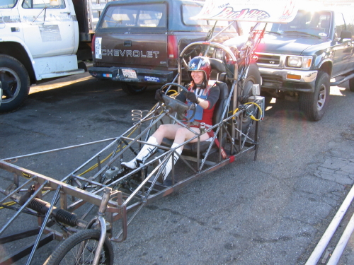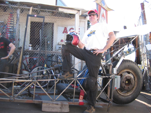 The Big Wheel 15′ Drag racer built by myself a few years back took 1st place (design) at the races held at Ace Auto in SF. Alan and I both got a chance to race and we actually won a race! We strongly believe we lost the rest of the races due to the wind, uphill course, lack of quality 110v power, wrong t-shirt, lack of support form our sponsors, not enough NITROUS, no cheerleaders, too little red, white and blue, and the fact that we ran the bar. Next race we plan to incorporate more smoke in hopes no will notice were not really moving too fast. The fire behind our seat in the last race helped distract the attention away from the real winner significantly.