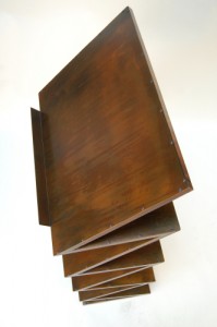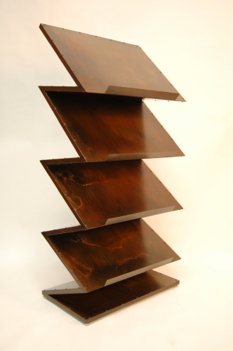 Gumps commissioned me to make them a shelf to hold large picture books! It’s been a great project and they are wonderful to work with. This project involved both the technical challenge of a seemingly unsupported zig zag and a purposed design that is not an everyday need. With the wonderful patina we added, it will make a beautiful sculpture and show off any art books uniquely. I can see my favorite turn of the century tool book on top opened to the page of a Horizontal Drill Press with the operator wearing a tie and bowler hat!