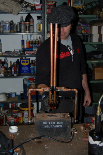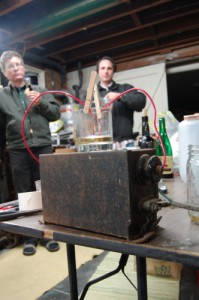 Several nights later we set up production at my shop in West Oakland and added a copper pipe system that featured a Jacobs ladder that could be short circuited in the drink to be “treated”. This gave the us the visual that was missing from the 1st night and more surface area in which the reaction could now take place. We now had a 15,000 volt cattle prod with plenty of places to grab that was going to be right in the middle of a bar!