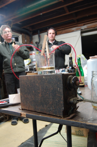 Starting the night my drinking buddies and I took over my wife’s Craft night to solve the problem of aging brandy before the “End of Ages” comes in 2012, we came across this single sentence in an old book from the 1930’s. “The treatment with pure oxygen gas with or without an electric burrent”. We discussed at long length what a burrent was and where we could get one, then decided it was a typo and they ment current. Fortunately I just happened to have a luminous transformer in my basement, fortunately for my house we were fresh out of oxygen (can you think of a more flammable cocktail)? A couple of clothespins, wire and a glass full of bitter brandy and we were ready. Not much could be seen as we pumped 15,000 volts into the brandy, but much to our surprise, once removed, the taste had smoothed considerably. We had drank to much at that point to finish the job, but settled on the name VOLT/AGED for our new process.